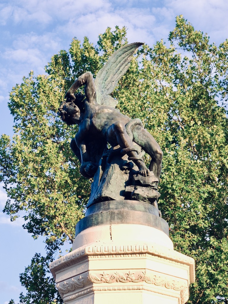 You will easily find the fountain in El Retiro Park. I thought it would be a bit out of the way, in a little nook. But no, it couldn’t have been more exposed than where it sits. But before arriving there, the statue travelled a bit. First made in Rome in 1877 by Ricardo Bellver, a Spanish sculptor, then cast in bronze in Paris for the Universal Exhibition of 1878, to finally arrive in Madrid in 1885.